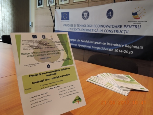 În data de 21 aprilie 2017, ora 1200, la sediul Facultății de Construcții și Instalații, corp R-parter, sala 0.1, Iași, Str. Prof.dr.doc. Dimitrie Mangeron, nr. 1, a avut loc seminarul „Principii de eco-sustenabilitate aplicate în construcții. Construcții verzi - principii și beneficii".