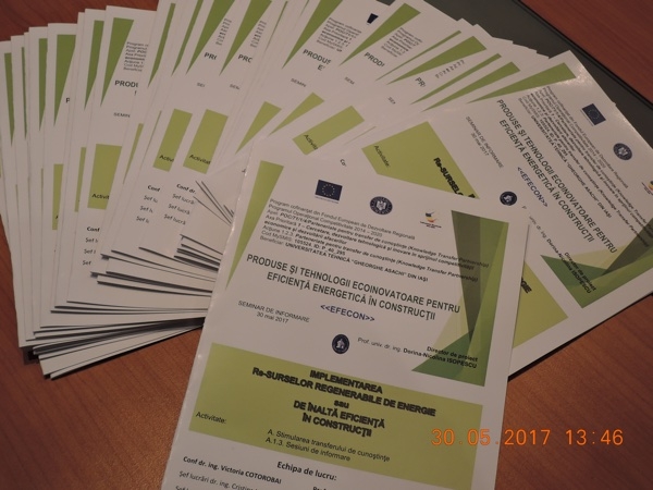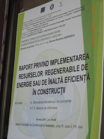 În data de 30 mai 2017, ora 1400, la sediul Facultății de Construcții și Instalații, corp R-parter, sala 0.1, Iași, Str. Prof.dr.doc. Dimitrie Mangeron, nr. 1, a avut loc seminarul „Raport privind implementarea surselor regenerabile de energie sau de înaltă eficiență în construcții".