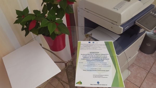 În data de 13 iunie 2018, ora 1600, la sediul Asociaţiei Breasla Constructorilor Ieşeni, str. Trei Fântâni, Iaşi, a avut loc workshop-ul nr. 4 „Analiză și discuții în vederea contractării pentru activități de tip B și C a unor contracte de parteneriat cu scopul implementării conceptelor de eficiență energetică în construcții".