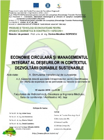 În data de 15 martie 2019 ora 9:30, la sediul Facultății de de Hidrotehnică și Ingineria Mediului, în Amfiteatrul A0, Iași, Str. Prof.dr.doc. Dimitrie Mangeron, nr. 1, a avut loc workshop-ul nr. 5 „Economie circulară și managementul integrat al deșeurilor în contextul dezvoltării durabile sustenabile".