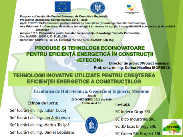 În data de 20 noiembrie 2020 ora 9:00, la sediul Facultății de de Hidrotehnică, Geodezie și Ingineria Mediului, în Amfiteatrul A0, Iași, Str. Prof.dr.doc. Dimitrie Mangeron, nr. 1, a avut loc workshop-ul nr. 6 „Tehnologii inovative utilizate pentru creșterea eficienței energetice a construcțiilor".